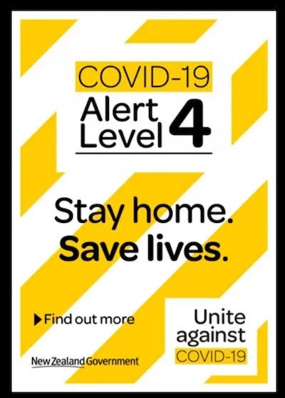 ニュージーランド政府からのお知らせ。みんなで一つになって闘おう、「ステイホーム、セイブライフ(ステイホームで命を救う)」というメッセージが書かれています。